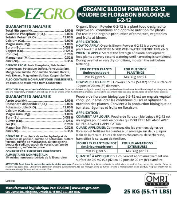 Ez-Gro Organic Powder Bloom 6-2-12 is an all-in-one powdered nutrient for the flowering/bloom stage that is suitable for organic use. It contains all major (nitrogen, potassium and phosphorus) nutrients as well as secondary (calcium and magnesium), and micro nutrients (zinc, copper, boron and iron).